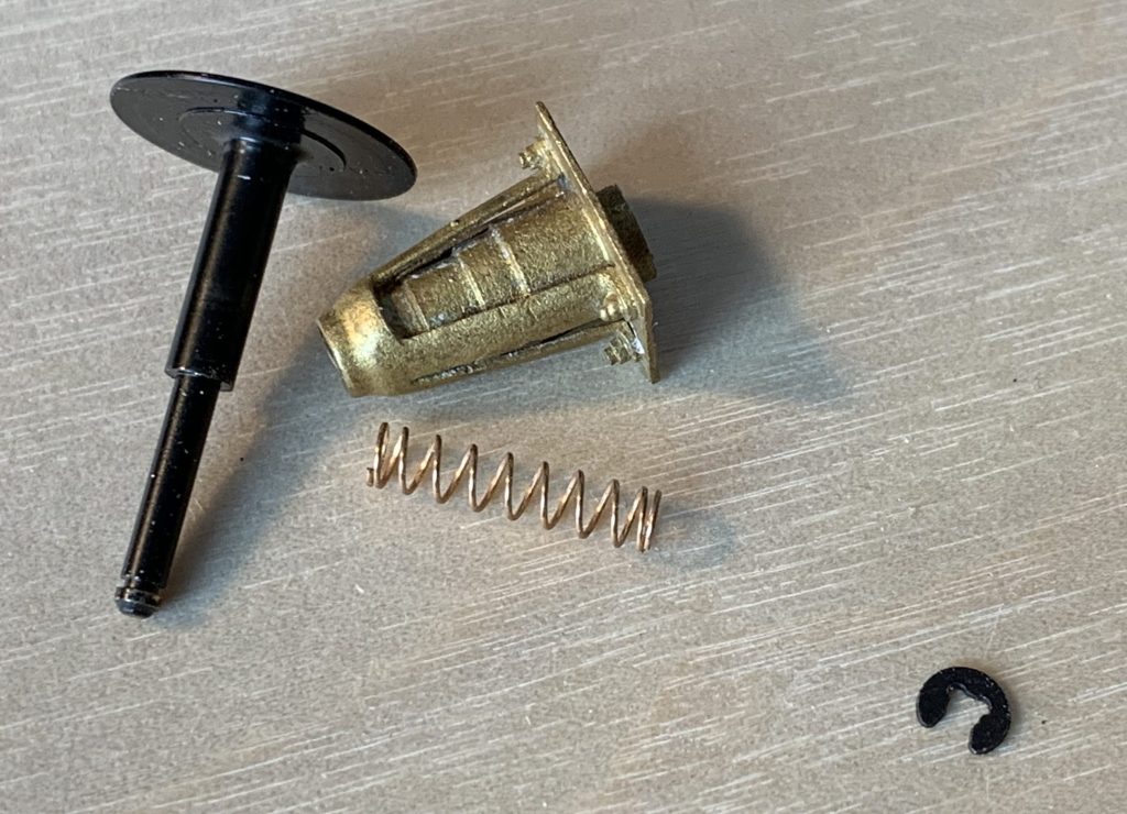 De var dog ikke helt nemme at samle, for inden i pufferne er der en støbegrat, der forhindrer pufferens frie gang frem og tilbage. Efter flere forskellige forsøg fandt jeg ud af at spænde hoveddelen fast i en skruetvinge og med et bor i min Dremel file sidelæns derinde, og så virkede det!