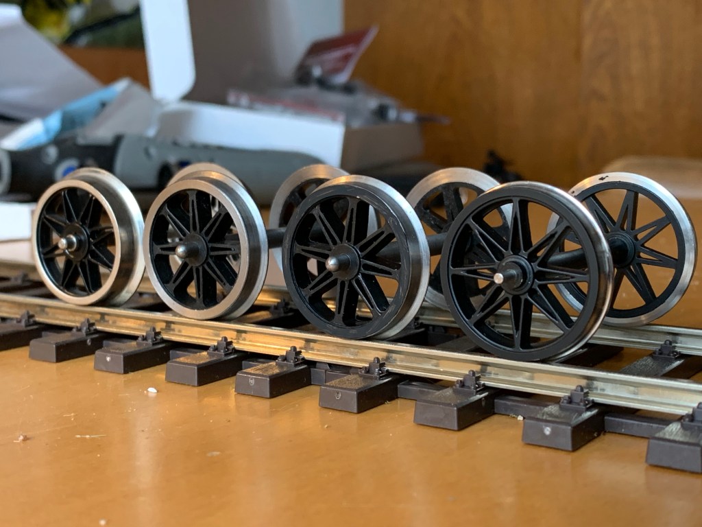 Jeg var meget fristet af Dinglers elegante hjulsæt med den fine flange, men efter flere advarsler om at de godt kunne afspore på Märklins spor, valgte jeg de lidt grovere sæt fra Slater’s, som også blev anbefalet af Proinor. Med lidt maling ser det hæderligt ud.