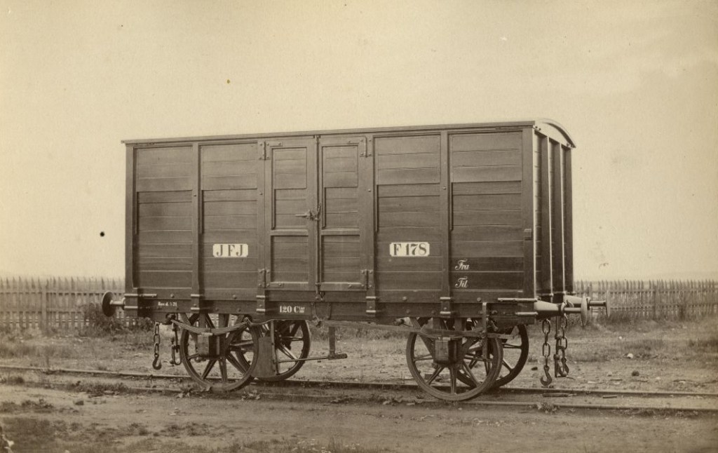 Ovenfor ses en lukket godsvogn fra de Jysk-Fynske Jernbaner, der blev bygget i 1871. Slægtskabet til de senere så almindelige Q-vogne er tydelig.