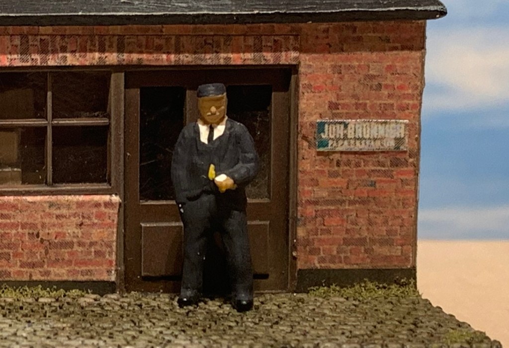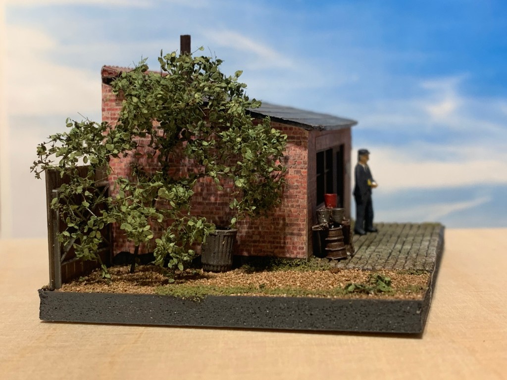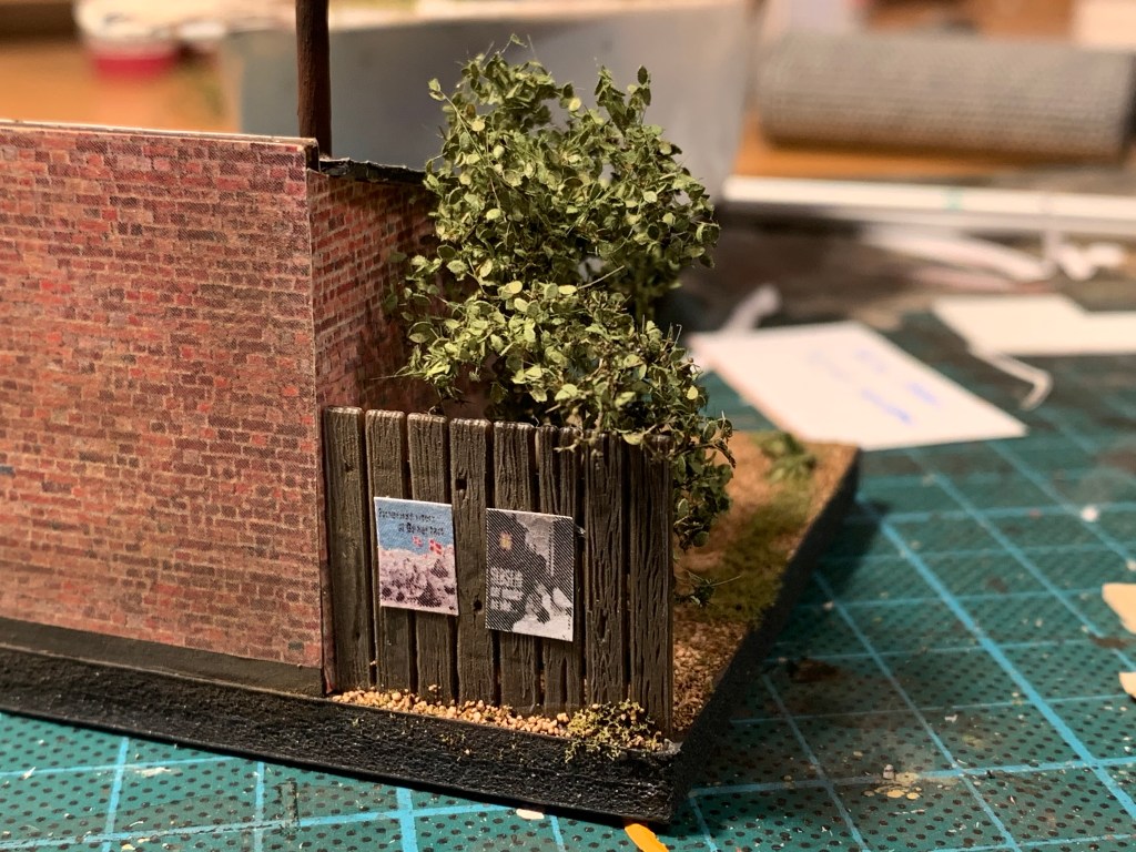 Endelig skar jeg en række tagsten til den bagerste mur, som jeg tænker enten vender ind mod en anden baggård eller måske ud mod banen, og sammen med lidt tønder, sække og hr Brünnich, så blev den lille baggårdsvignet færdig!