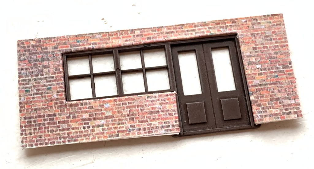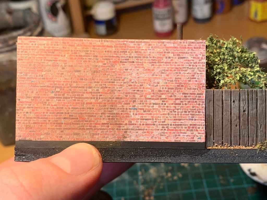 Så limede jeg noget printet gult murstenspapir på fra Scalescenes’ absolut anbefalelsesværdige produktion. Men det så forkert ud – stenene var for lyse, og jeg havde også glemt at skalere printet langt nok ned fra skala OO til HO, så stenene virkede for store. Så muren kom en tur under den varme hane!