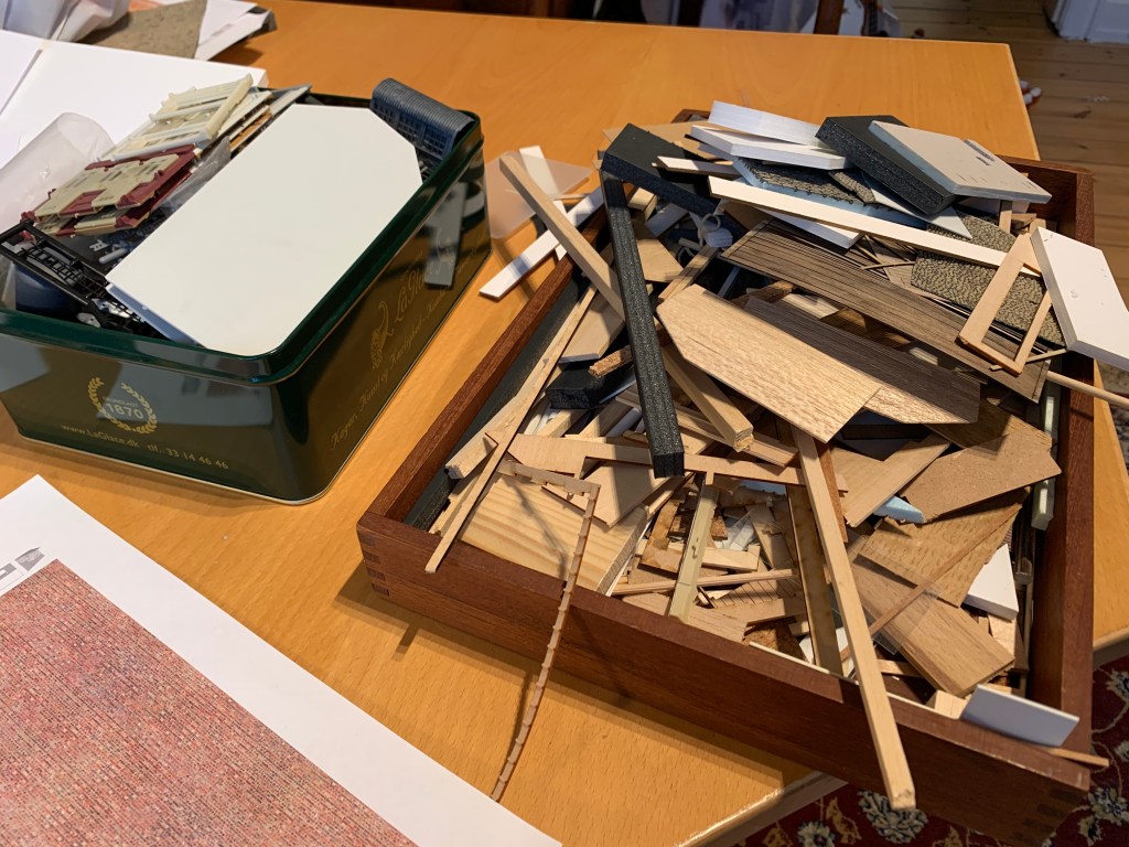 En bits box, eller rodekasse som man kunne kalde den på dansk, er en af modelbyggerens bedste værktøjer. Til højre ses min kasse fyldt med træ og plaststumper. Til venstre en kasse fyldt med gode stumper fra bygesæt, og dertil kommer mange flere små. Hvis man holder det nogenlunde organiseret, er det en guldgrube til fremtidens bygning.