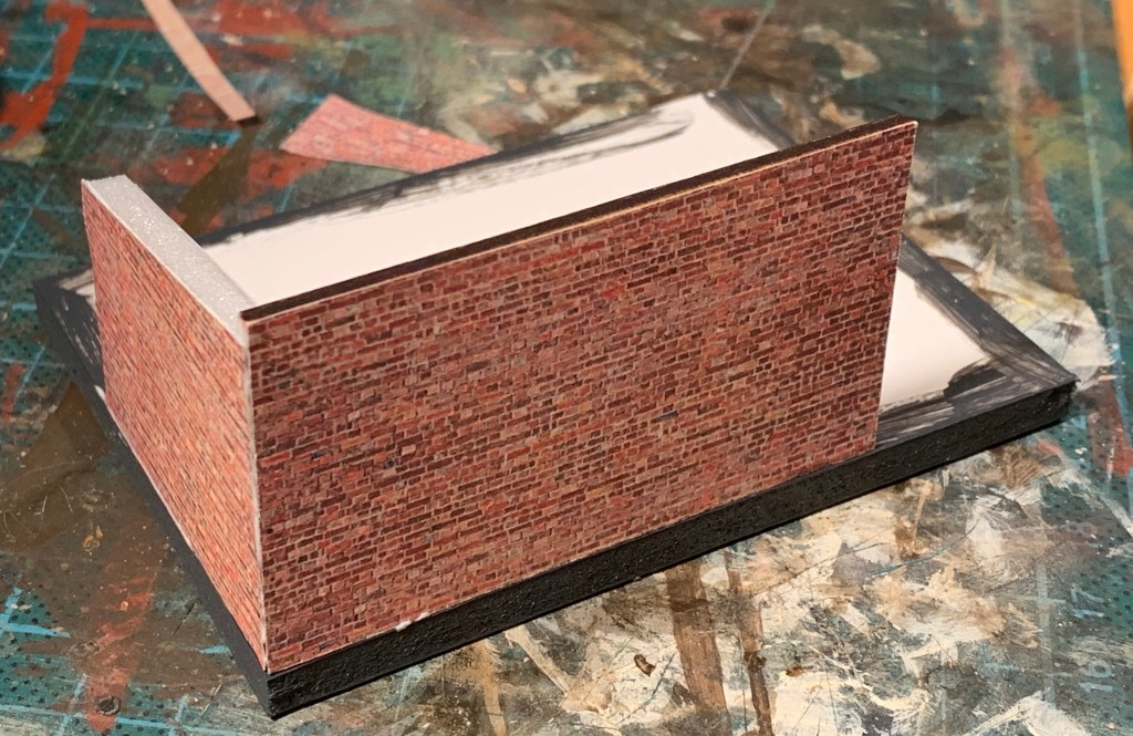 Så skar jeg tre mure mere ud af træ- og plaststumper fra min bits box sammen med en base ud af foamcard. Jeg prøvede mig lidt frem med murenes størrelse, indtil bygningen så fornuftig ud.