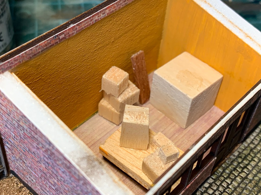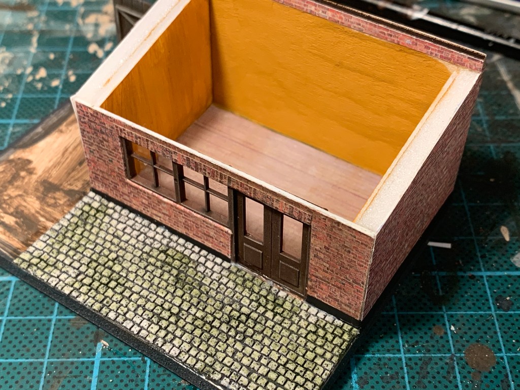 Derfor malede jeg væggene mørkegule og satte derefter et printet, beskidt bræddegulv fra Scalescenes ind på bunden.