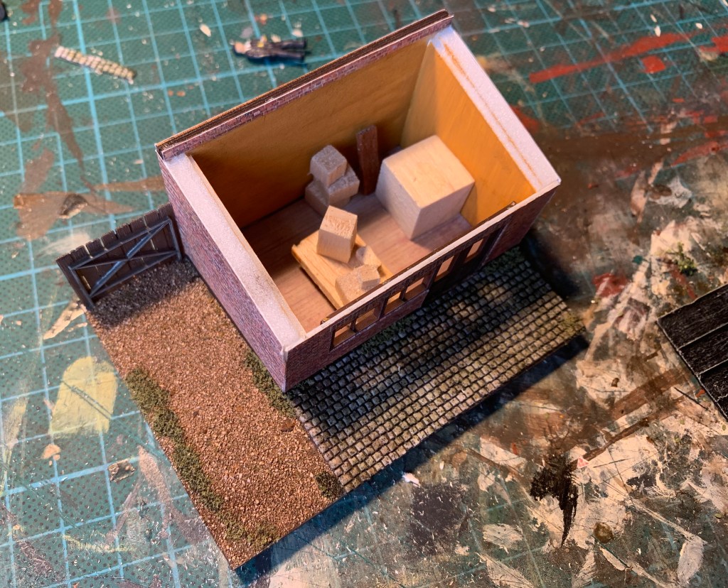 Ved siden af den lille fabrik satte jeg en stump plankeværk fra rodekassen op, og lidt jord fra en blanding, jeg altid har stående på bordet og jævnligt tilsætter forskelligt rod til. Dertil lidt lavt græs i hjørnerne.