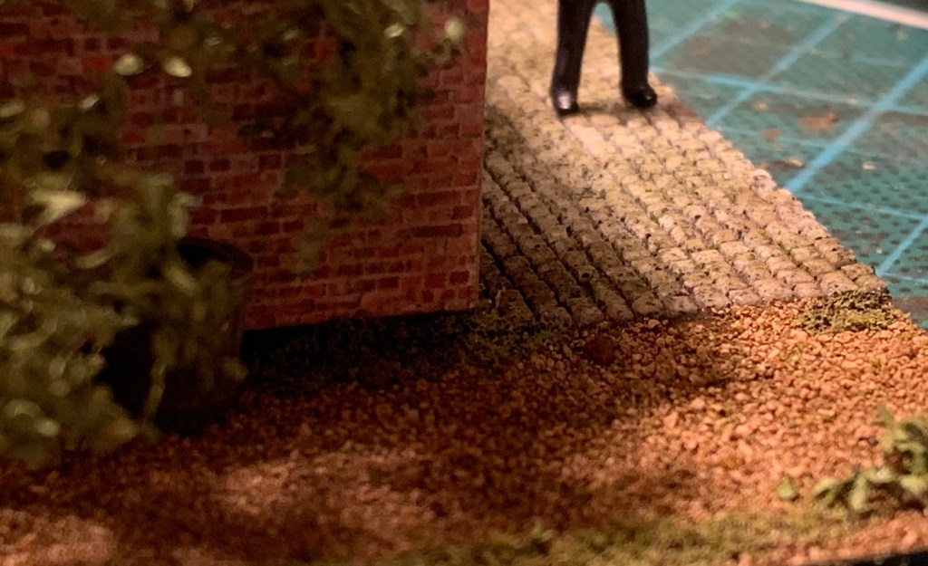 Foran baggårdsbygningen satte jeg lidt brostensplade af den nye lækre type fra Noch og gav den i første omgang lidt grøn wash hist og her.