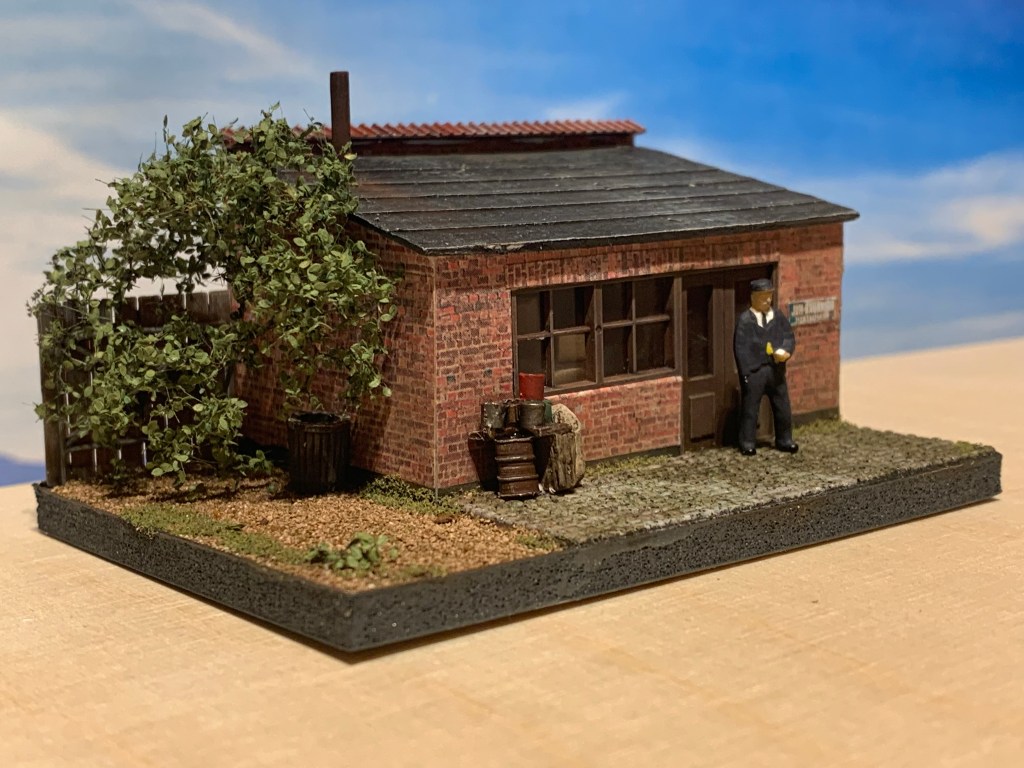 Taget lavede jeg ud af endnu en stump plasticard, og beklædte den med striber af papir for at illudere tagpap. Den malede jeg sort og drybrushede med lysegrå for at få lidt spil i farverne. Jeg fandt også en lille stump rundstok, som jeg udborede og brugte som skorstensrør.