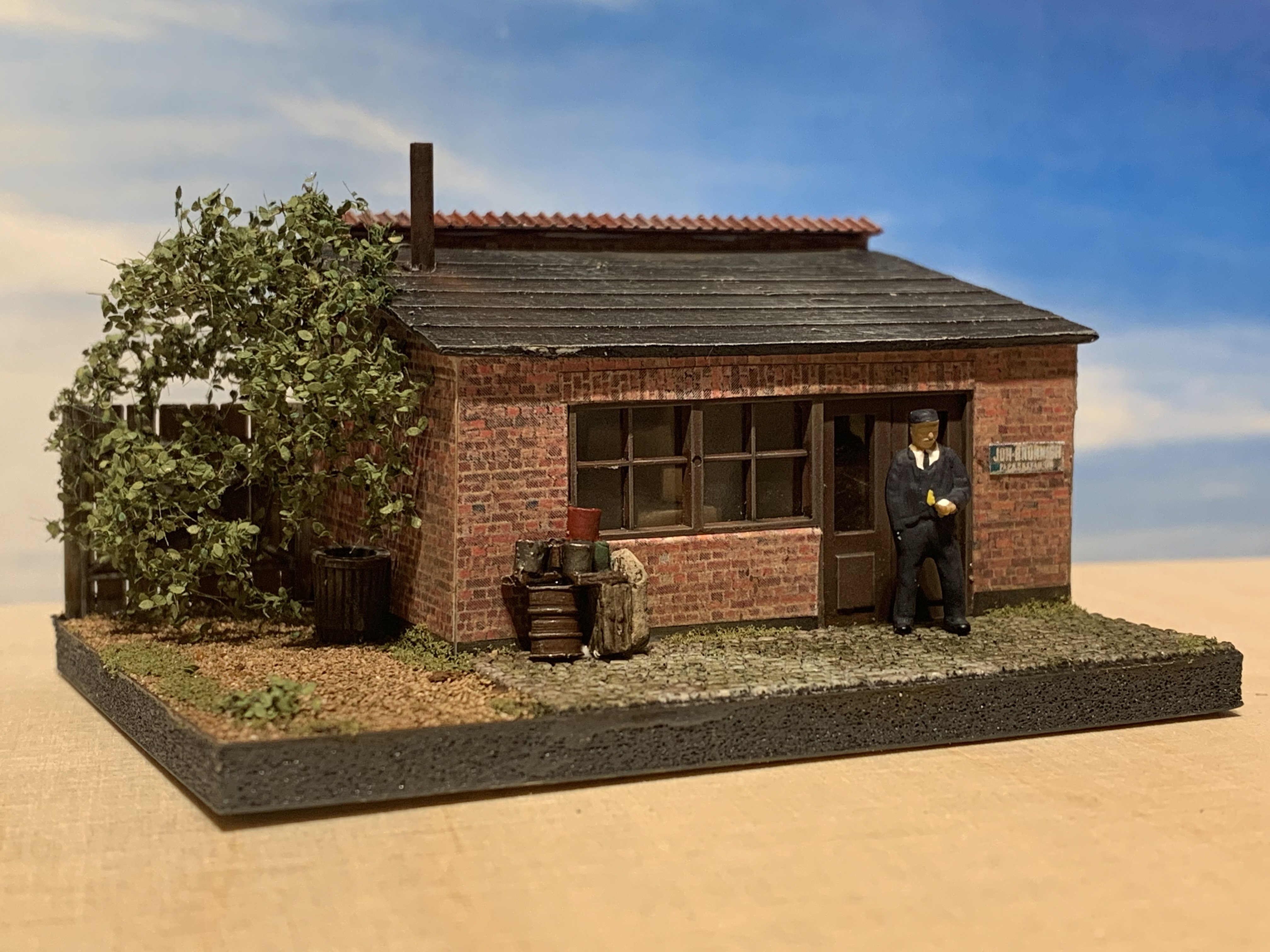 Taget lavede jeg ud af endnu en stump plasticard, og beklædte den med striber af papir for at illudere tagpap. Den malede jeg sort og drybrushede med lysegrå for at få lidt spil i farverne. Jeg fandt også en lille stump rundstok, som jeg udborede og brugte som skorstensrør.