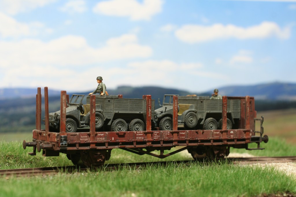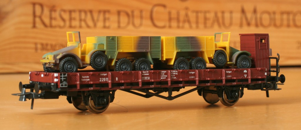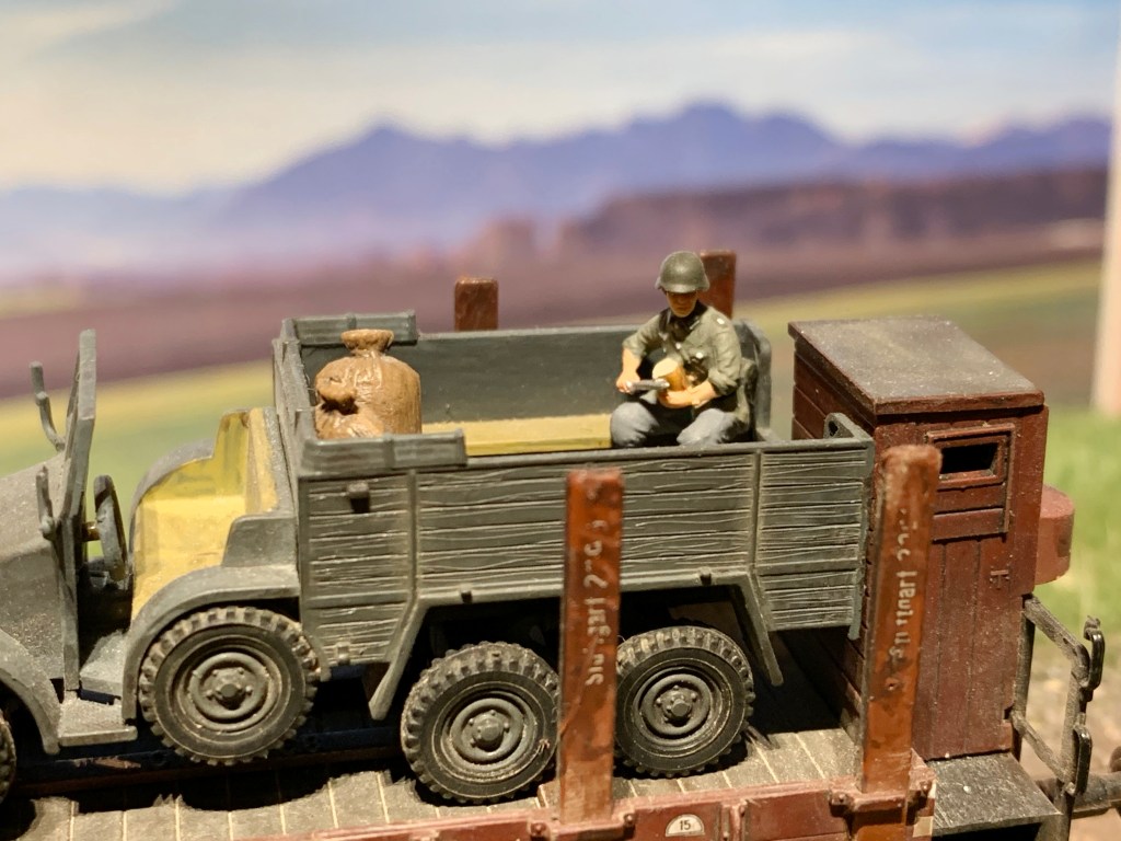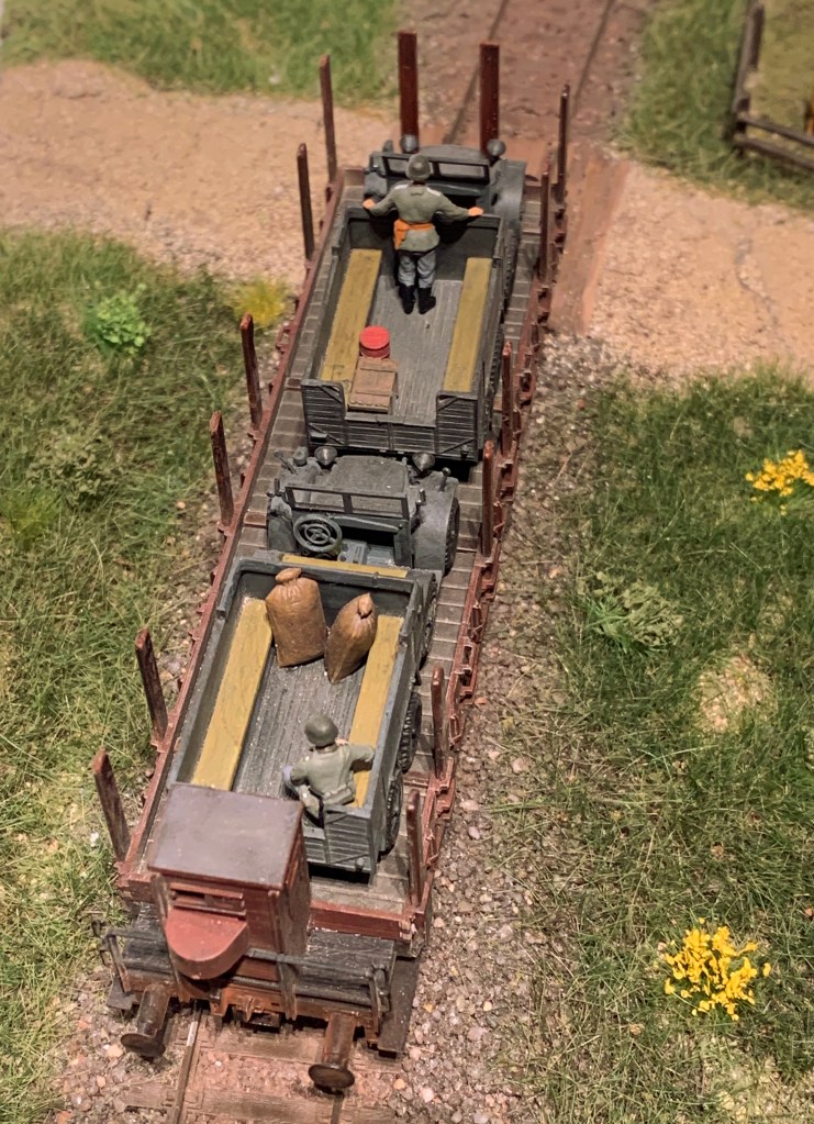 Som det ses, tilføjede jeg et par soldater og lidt grej i lastbilerne. På billeder af militære jernbanetransporter fra tiden har jeg set flere eksempler, der mest af alt lignede en rullende campingplads, så jeg forsøgte at få bare lidt af den stemning med.