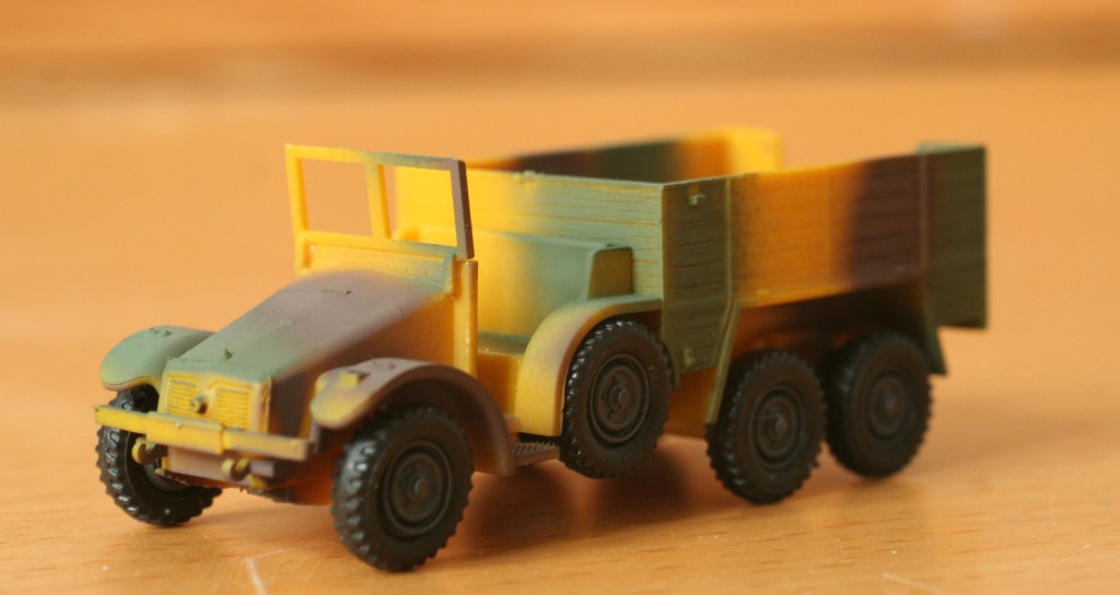 Lastbilmodellerne var ret fine modeller i den lille skala 1:87. Den skriggule plastik, de var støbt i, skulle illudere farven Dunkelgelb, som den tyske hær brugte som grundfarve i den sidste del af krigen, men det var ikke for kønt. Forruden sad i en mystisk vinkel, så den brækkede jeg af og limede fast på ny.