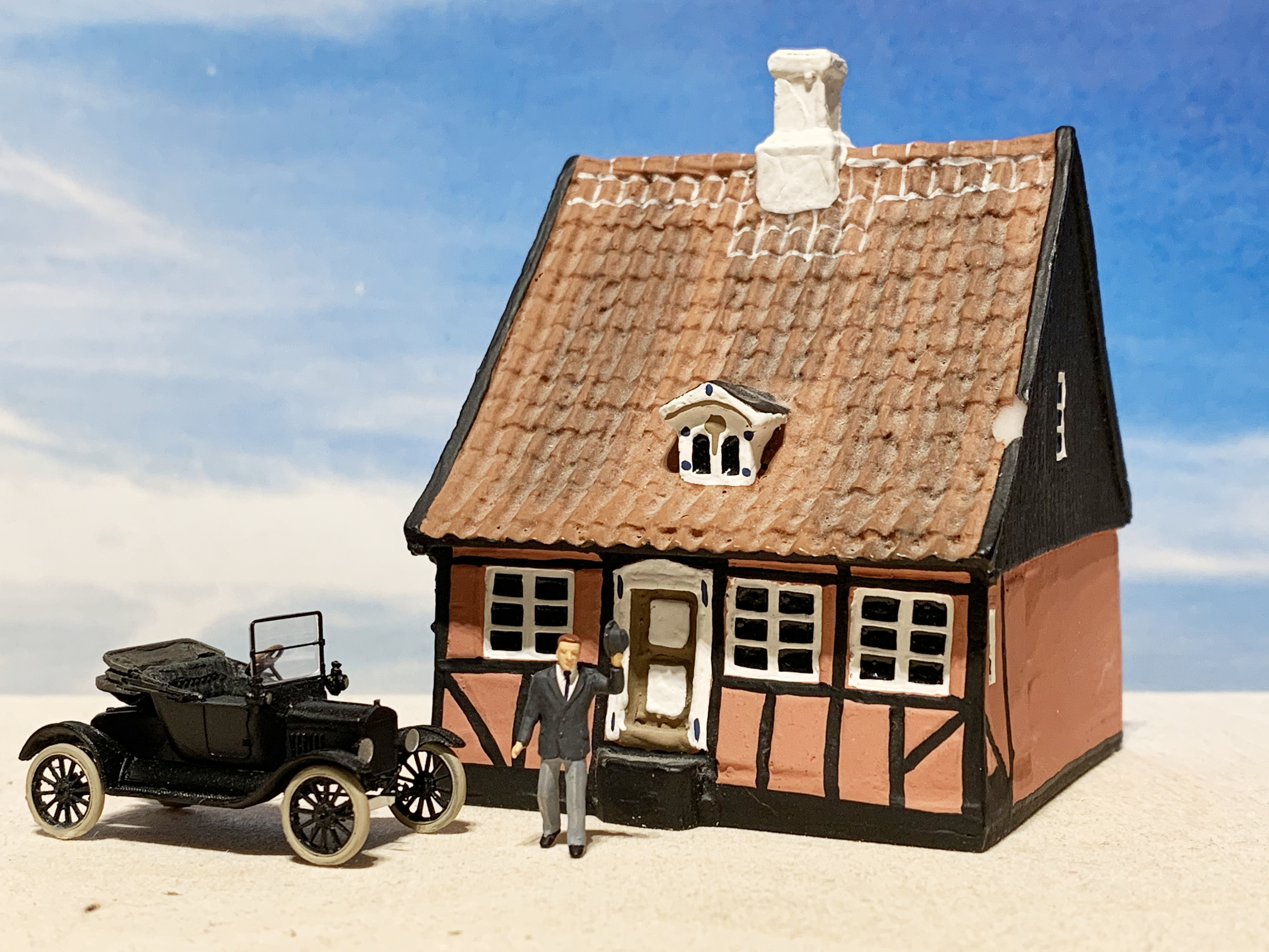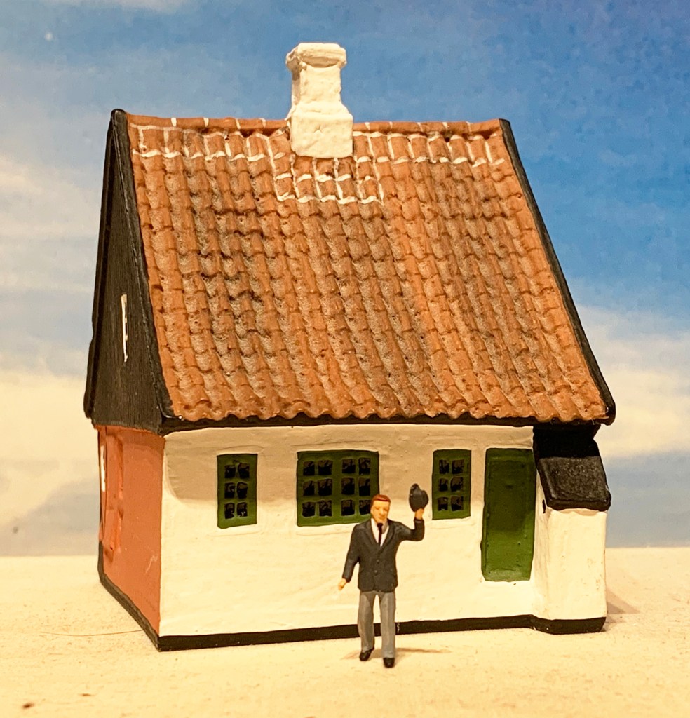 Modellen er 58 mm bred, 66 mm dyb og 70 mm op til tagryggen. Omregnet til 1:1 skulle huset så være 5 meter bredt hvis skalaen er 1:87- mon det passer?