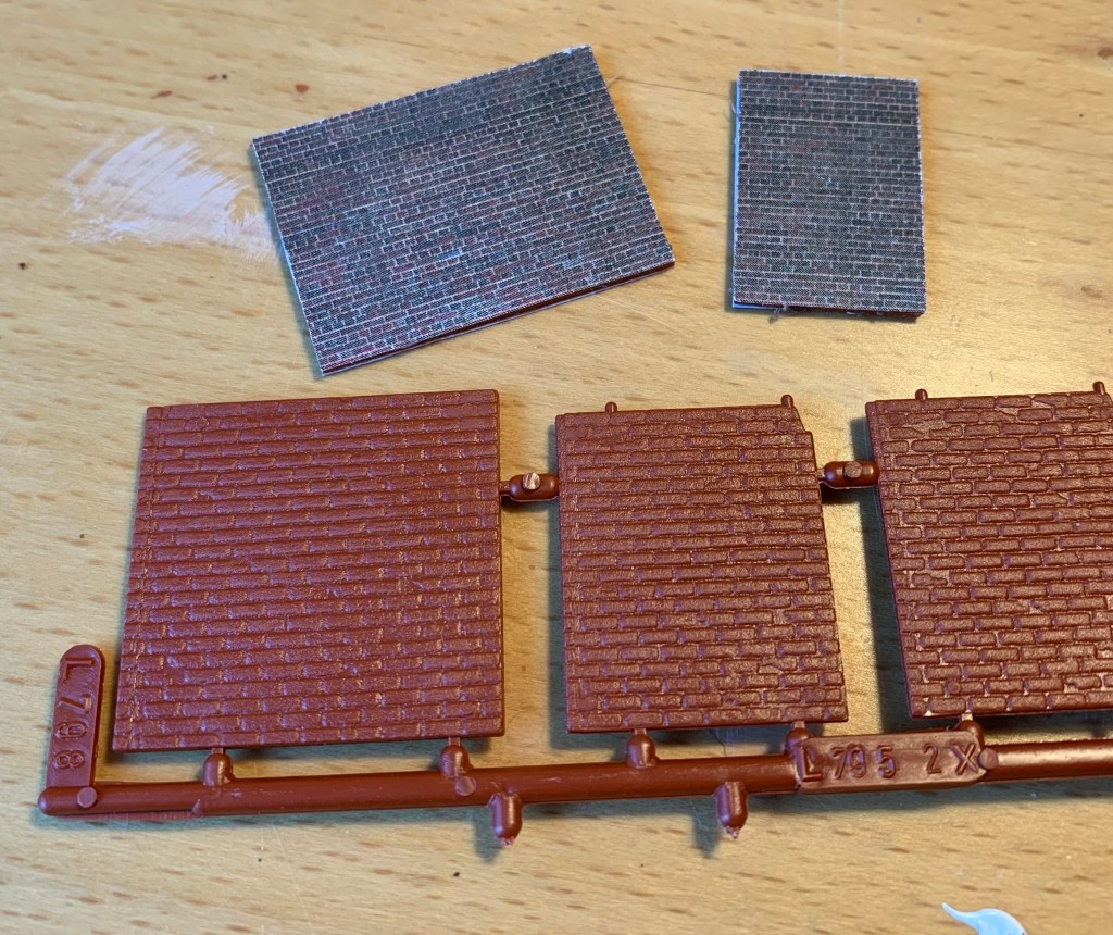 Derfor forsøgte jeg mig med forskellige typer murstenspapir fra Scalescenes. Her køber man en pdf-fil med en tekstur i skala 00, altså 1:76, og så kan man printe og skalere efter behov.