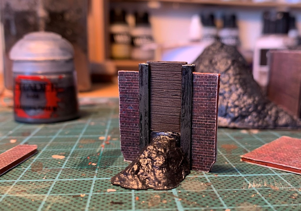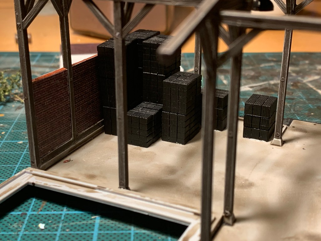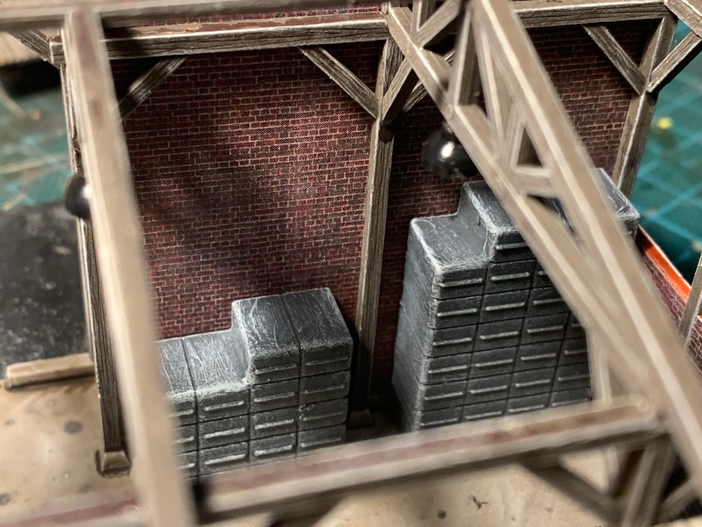 Med i sættet fulgte alverdens ting til at sætte inde i den åbne bygning. Mon ikke det er briketter af kul eller koks? Jeg malede dem halvblank sort og limede dem fast i hjørnet.