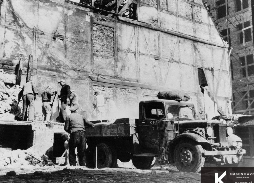 Billedet ovenfor, også fra Københavns Museum, viser en lastvogn med gasgenerator på siden ved nedrivning af Borgergade-kvarteret i 1944.